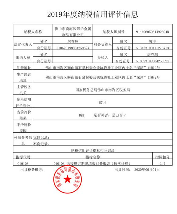 2019年度纳税信用评价信息